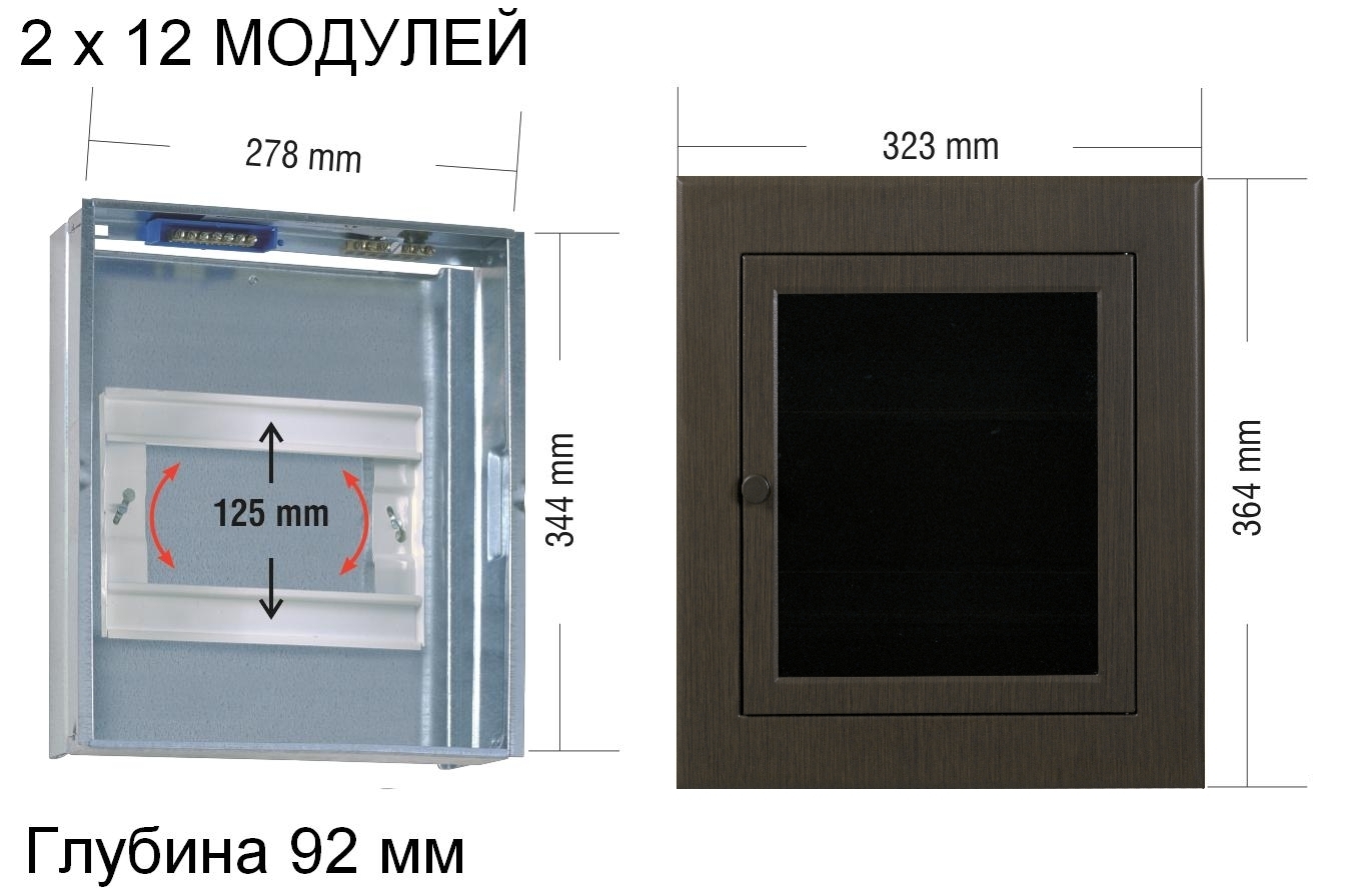 | Вместимость щита: 24 модуля (2 ряда по 12 модулей) |
